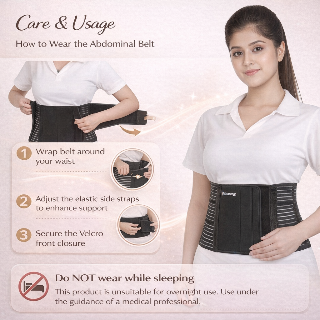 Usage Guidance: Wear during daily activities for abdominal support. Not recommended while sleeping. Hand wash gently and air dry to maintain elasticity and fit.