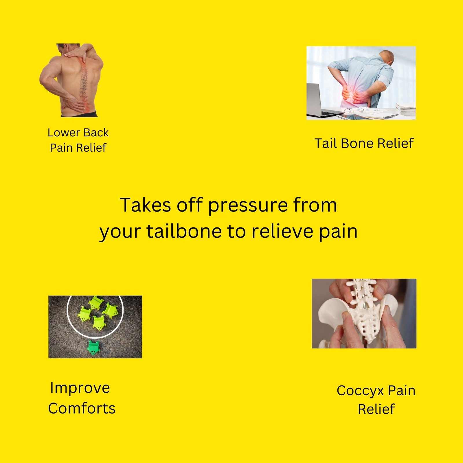 Rear cut-out seat design → reduces direct pressure on tailbone area → more comfortable sitting on office chairs, cars, and wheelchairs.