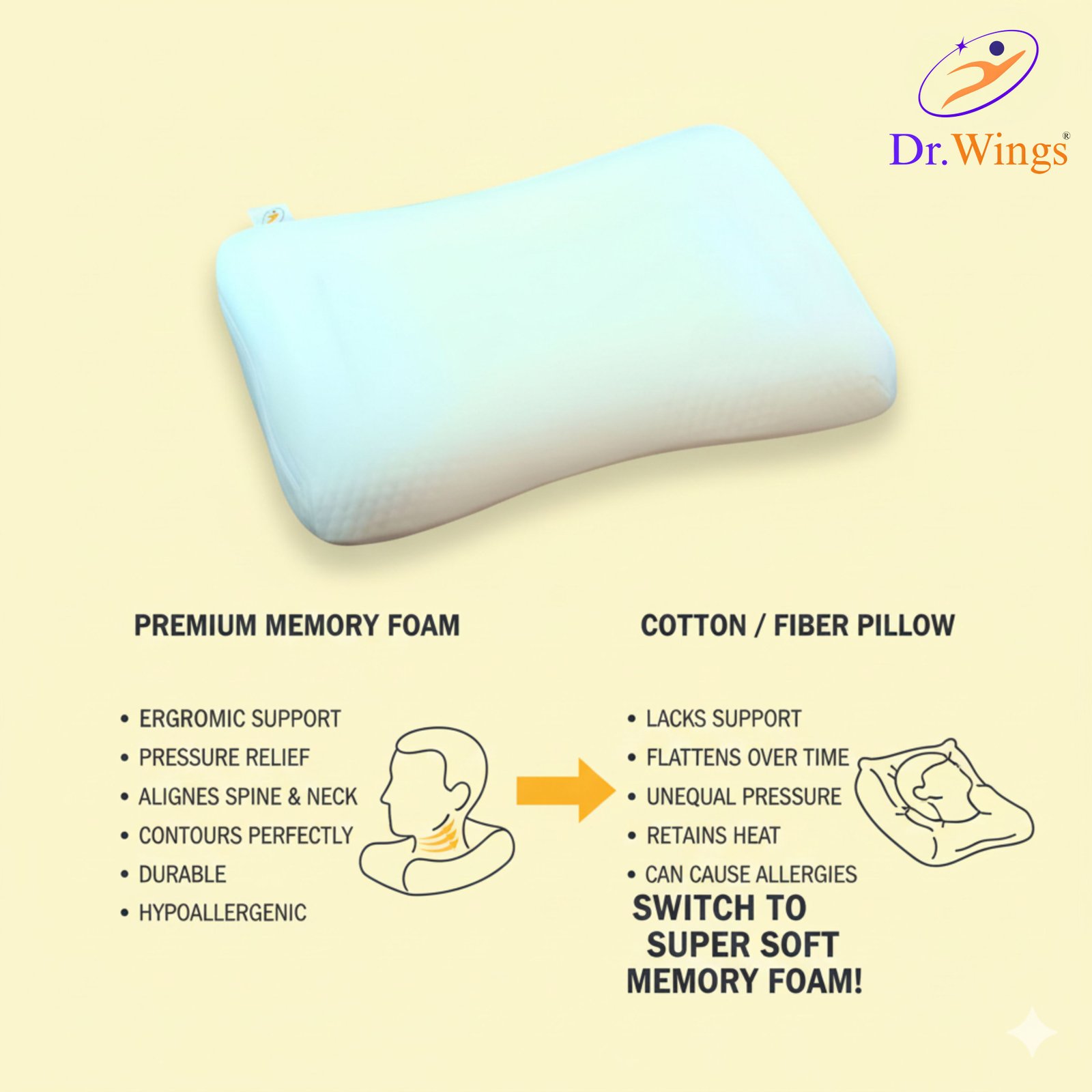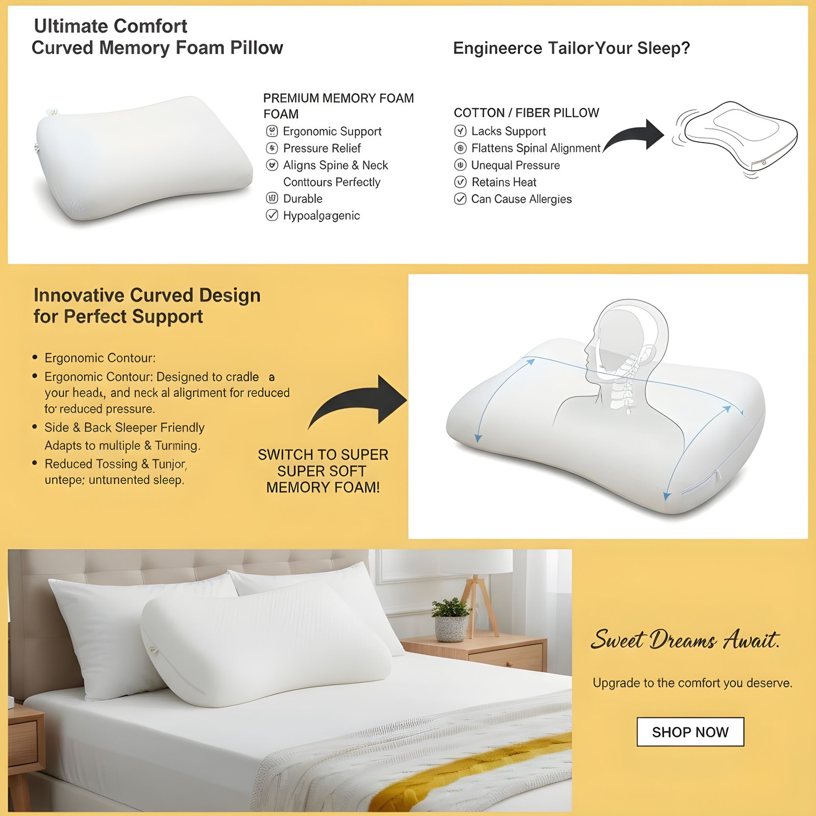 Curved sleep design with neck space → maintains natural sleep posture → more relaxed and comfortable nights