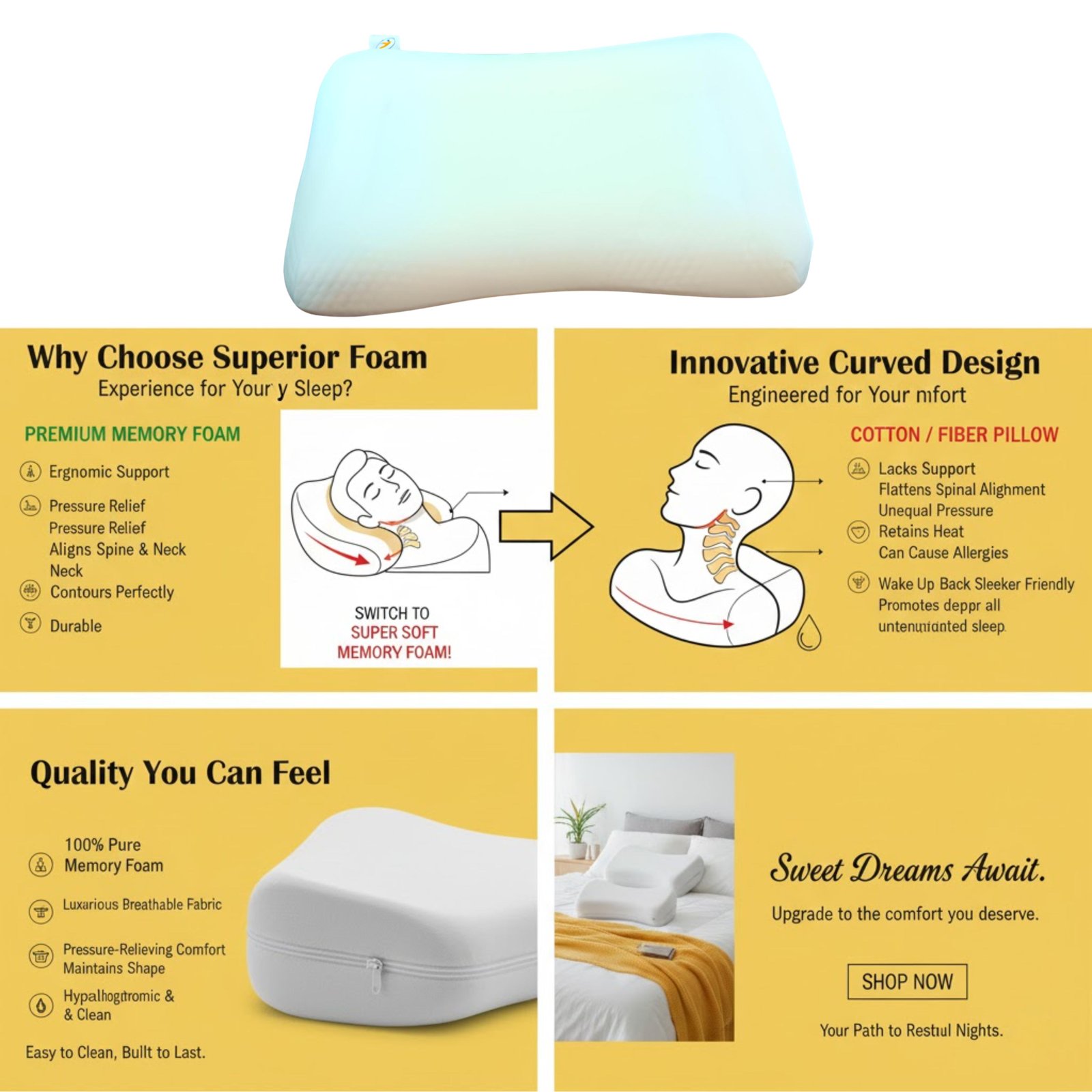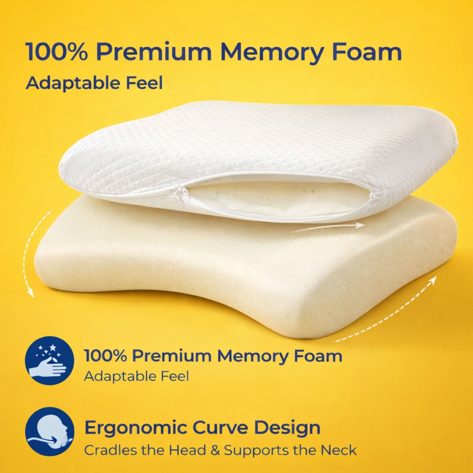 Adaptive memory foam core → responds to head movement → consistent comfort through the night